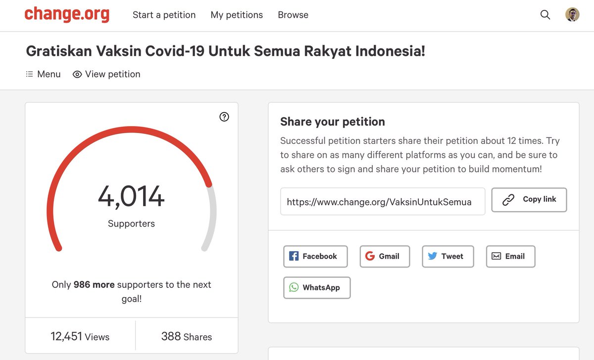 kita akan bangun aliansi dgn berbagai kelompok masyarakat sipil untuk mendukung petisi ini untuk mendesak Presiden Joko Widodo untuk MENGGRATISKAN vaksin covid buat semua warga negara Indonesia. karena ini untuk kepentingan kita semua.