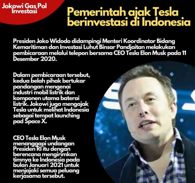 CEO Tesla Elon Musk menanggapi undangan Presiden RI Joko Widodo dengan rencana mengirimkan timnya ke Indonesia pada bulan Januari 2021 untuk menjajaki semua peluang kerjasama tersebut.