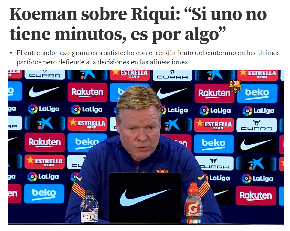 El misteri Riqui Puig continua. Koeman va dir a l'estiu que no era cert que no hi comptés però que no jugaria. Ara diu que està content amb el seu rendiment però que si no juga és per alguna cosa. Estaria bé que per una vegada expliqués aquesta cosa que els demés no veiem. 🔽