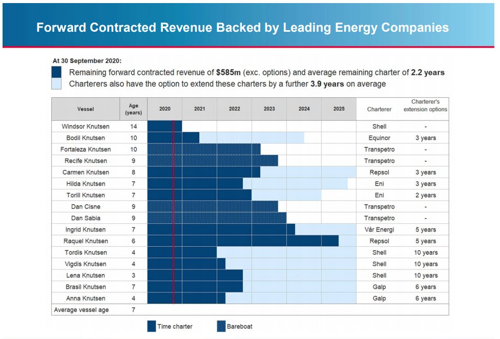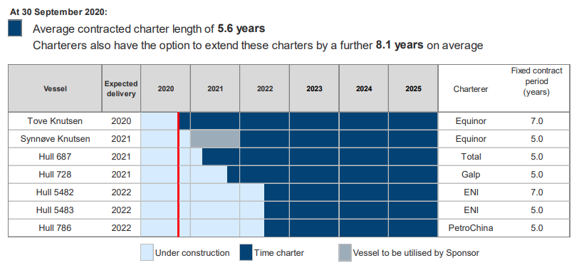 Las estimaciones para el precio breakeven están sobre los 40$-45$/b. $KNOP cuenta con un pipeline de nuevos barcos que puede adquirir en los próximos años, que le permitirán seguir creciendo. Los charters para esta flota es de 5.6 años de media, con posible extensión de 8.1.