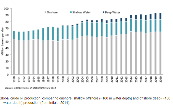 Al contrario de lo que pueda parecer, el consumo de petróleo crece cada año (aunque a ritmo lento), y la producción offshore ha ido aumentando también, si bien es, en general, más cara que la producción onshore, por lo que el precio del petróleo puede tener fuerte efecto.