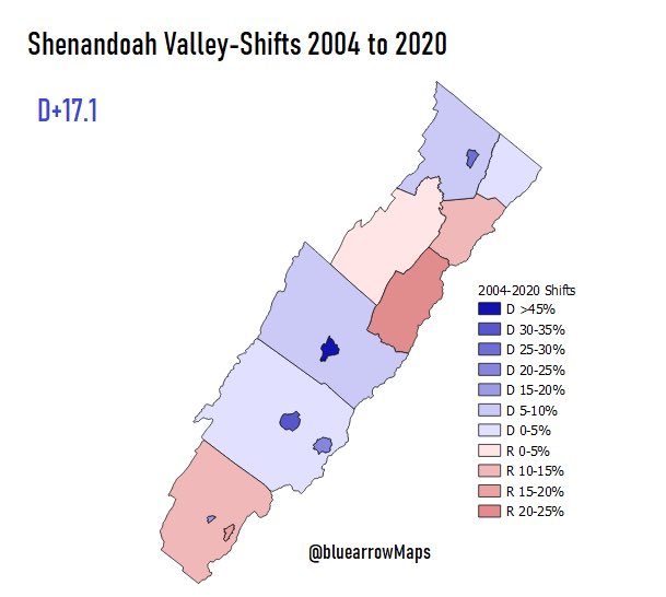 The Shenandoah Valley (as defined by the VA department of tourism) is pretty Republican area, but Joe Biden managed to crack 40% in 2020. He mainly did well in the cities of Winchester, Lexington, Staunton, and Harrisonburg (more maps in thread) #ElectionTwitter