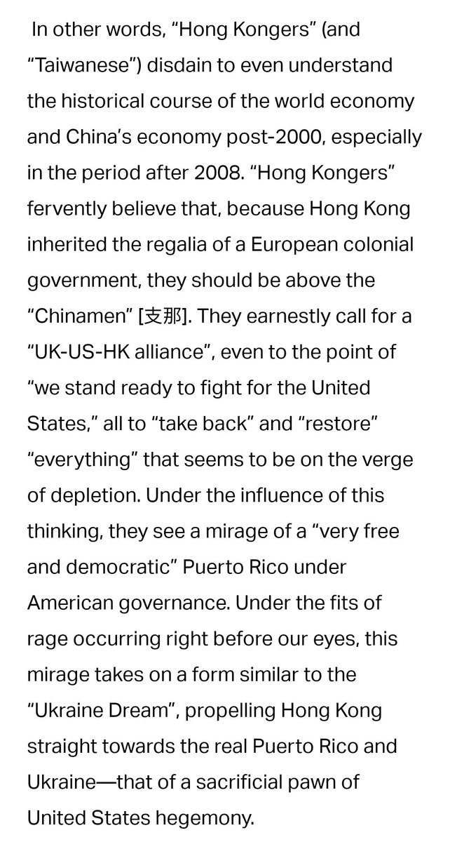 “'Hong Kongers' fervently believe that, because HK inherited a European colonial government, they are above the 'Chinamen.' As proxies of imperialism, they fear they could lose their favored positions & strive to reclaim their sense of superiority."