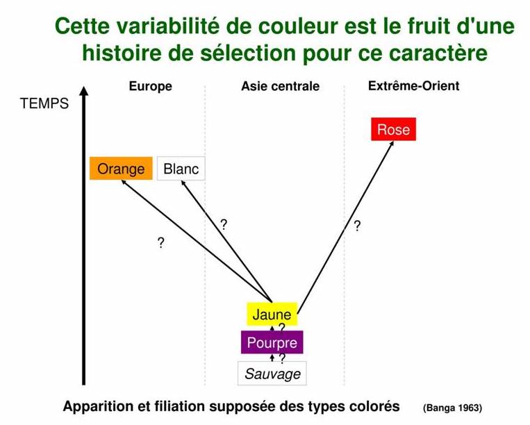 Ainsi sélectionner des carottes oranges n'est pas si direct et c'est bien les efforts de sélection pour une couleur attrayante plutot que pour les aspects de nutrition qui ont abouti aux carottes bien oranges d'aujourd'hui
