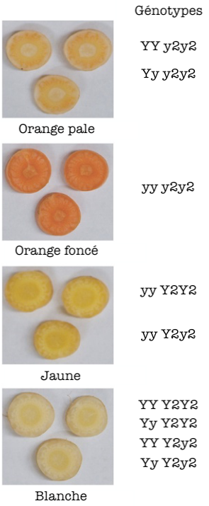 - soit de xanthophylles et de carotènes pour le génotypes y2y2 : la couleur est alors orange foncé