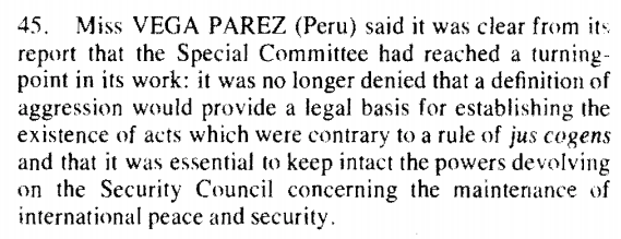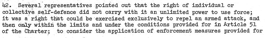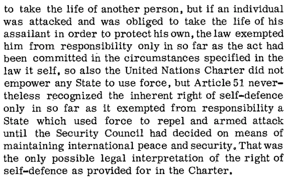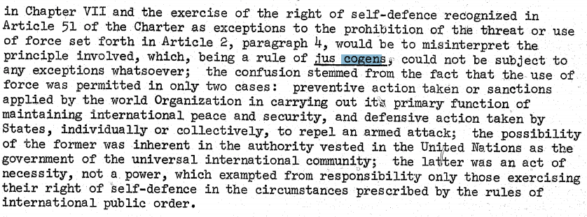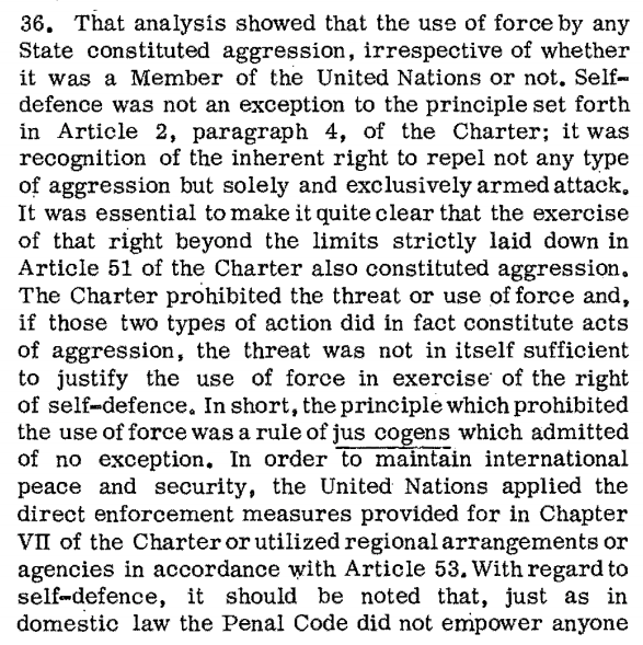 5. Finally, one State put forward the fascinating theory that self-defense is not an exception to the prohibition of force, but instead a circumstance precluding responsibility (an excuse) ... for the breach of a jus cogens norm?!