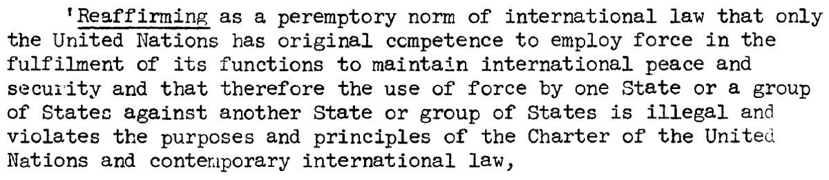 2. The thirteen-power draft stated in its preamble that the use of force by one State or a group of States against another State or group of States violated a peremptory norm of international law.