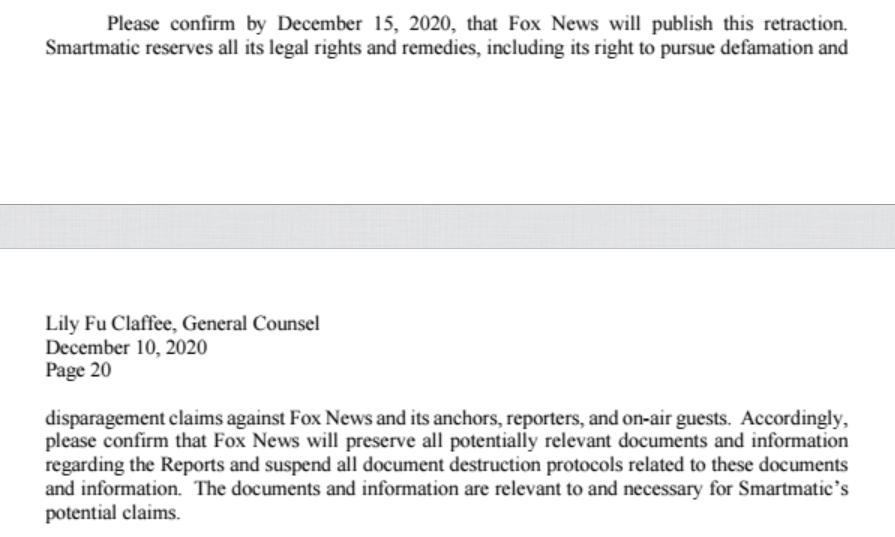New: Here's the retraction demand sent Friday to @FoxNews by voting tech company Smartmatic - featuring nearly 20 pages of eye-popping claims floated by guests and hosts alike. documentcloud.org/documents/7338…