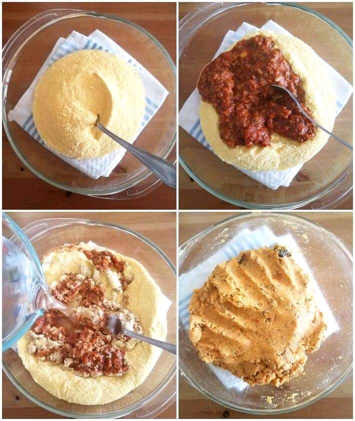 Amasar la harina pre-cocida con un poco de agua como de costumbre con una pizca de sal,
