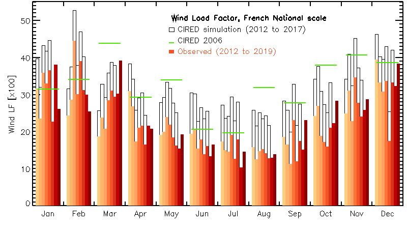 Passons à la production éolienne. Les hypothèses de facteur de charge sont nettement supérieurs à ce que on constate aujourd'hui : En vert les valeurs mensuelles utilisées dans la simulation; en couleur ce qui a été observé ces dernières années