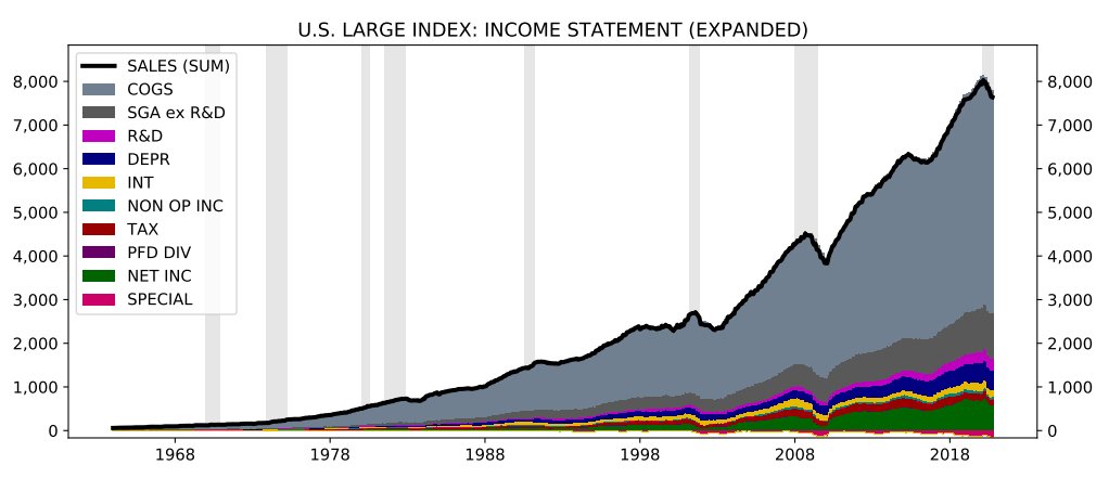 In addition to doing dispersion work on individual stock returns, valuations, profitability, etc., etc. code aggregates income statements, balance sheets, & cash flow statements of companies in the index (which user defines) and presents those as graphics. Example: