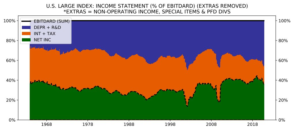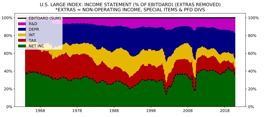 Here's bottom line portion of SPX income statement expressed as a % of EBITDARD. (New term--EBITDA w/ R&D treated as if it were CAPEX. Incoherent to exclude CAPEX depreciation expense from an earnings measure but then allow R&D expense to be included. Should be expensed alike)