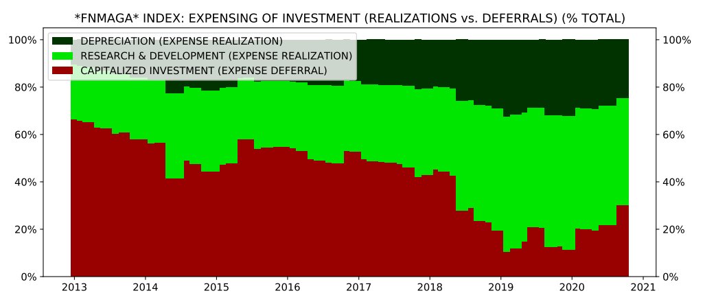 One thing that stands out is role of declining interest & tax expense in SPX margin increase from early 1990s to present. In chart below, interest & taxes (orange) and depreciation & R&D expense are grouped (purple). You can see the massively shrinking orange, while purple grows.