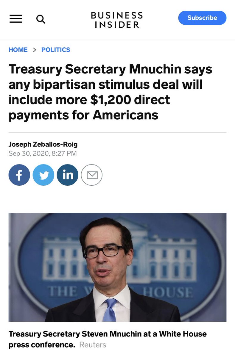Three parties to the deal: House Dems, WH, Senate Rs (who need Ds to pass anything). House Ds start at 3.4T. WH offers 1.8T. Trade liability for 600B in goodies, end at 1.2T total incl state/local, $1,200 checks & $300 UI. Dems come down 2.2T, McConnell up $700b. More than fair.