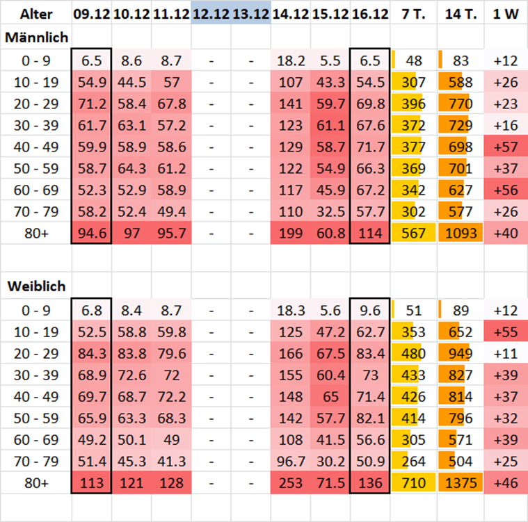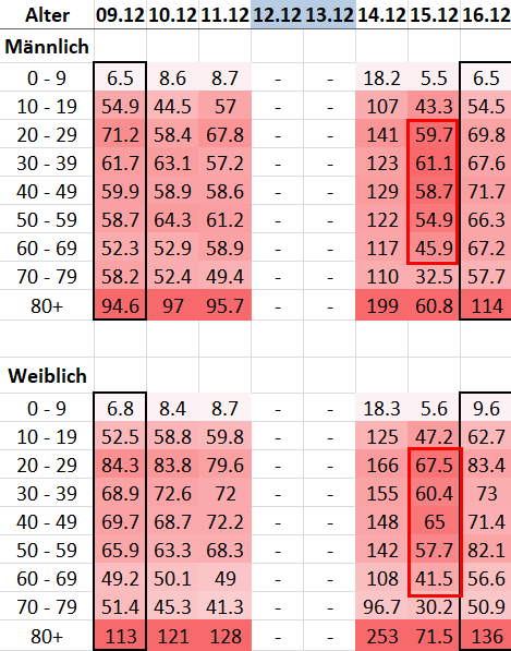 Man sieht den Effekt der Massentests in GR auf die gestrigen Daten (15.12.) sehr deutlich: An diesen Tests haben mehr jüngere Personen teilgenommen und wurden positiv getestet. Heute (16.12.) sind keine Daten der Massentests mehr enthalten und die Jüngeren wieder untervertreten.