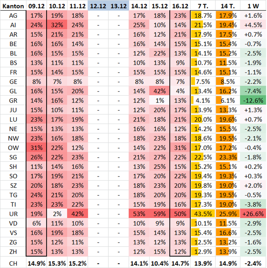 Veränd. in Prozent der Anz. Fälle pro Kanton in 1 Woche zur Vorwoche: