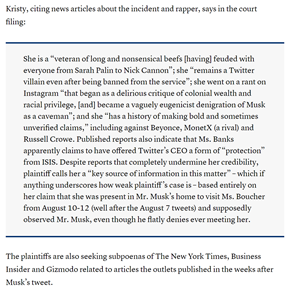 “Musk’s attorney, argued in a motion filed ..that the proposed subpoena of .. Grimes, who was dating Musk in August when he tweeted ..., is an effort to “sensationalize these proceedings” rather than a legitimate fact-finding mission.”