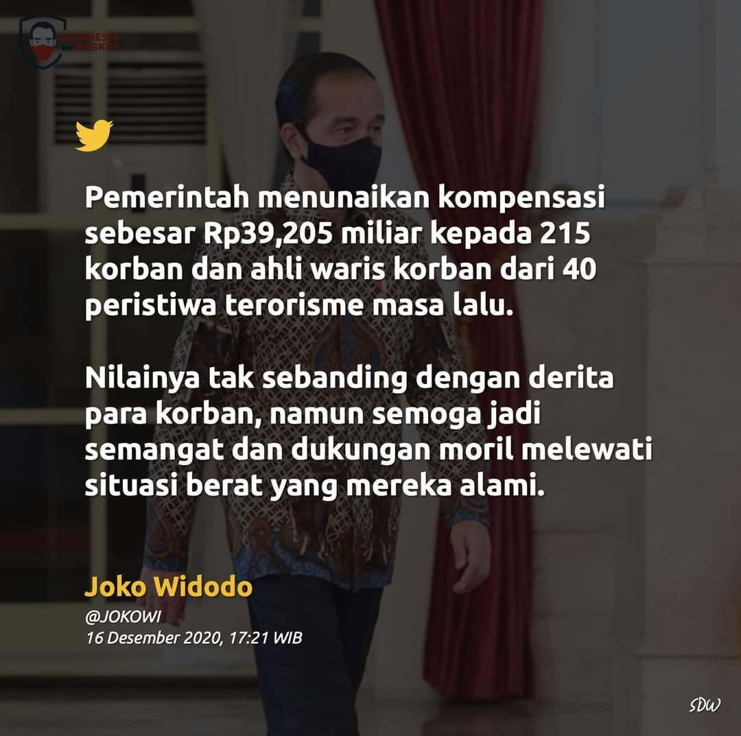 Presiden Joko Widodo (Jokowi) menyerahkan kompensasi kepada korban tindak pidana terorisme dengan total sebesar Rp 39,205 miliar terhadap 215 korban dan ahli waris dari 40 peristiwa terorisme.