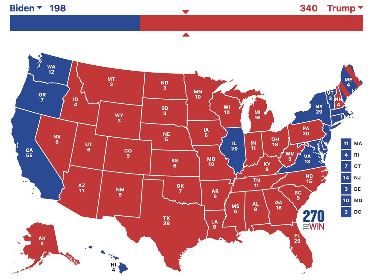 ١٩/٢٢ ترامپ از ٢٠١۶ آرا بیشتری کسب کرد و اگر رای آبی مشابه ٢٠١۶ باقی میماند، نقشه زیر حاصل میشد. اما همانگونه که پیشبینی میشد نرخ مشارکت در انتخابات ٢٠٢٠ رشد چشمگیری داشت. ترامپ از پیشبینیها بهتر عمل کرد اما در مقام ر.ج فعلی شکست سختی خورد.
