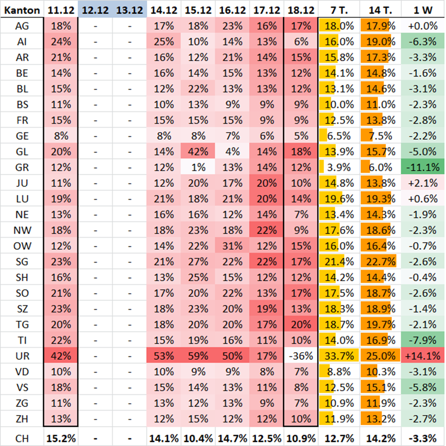Veränd. in Prozent der Anz. Fälle pro Kanton in 1 Woche zur Vorwoche: