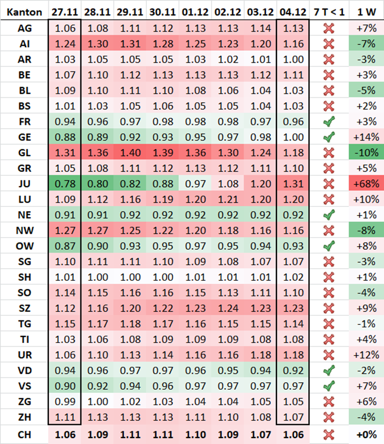 Kantone mit R < 1 in den letzten 7 Tagen: