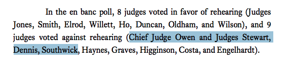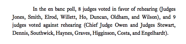 A member of the 5th Circuit moved for the full court—all 17 judges in active status—to rehear the case rather than letting the three-judge panel's decision stand. That motion filed by a vote of 8 judges in favor of rehearing to 9 judges opposed. 6/