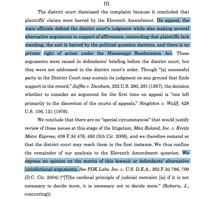 On appeal, a three-judge panel of the 5th Circuit held that MS is not immune from suit for alleged violations of the MS Readmission Act. ca5.uscourts.gov/opinions/pub/1… 4/