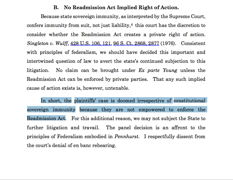 Since only six dissenters agreed to Part IIA (and since nine judges declined to rehear this issue), it seems clear that the 5th Circuit believes the MS Readmission Act is enforceable—at least in the abstract. 8/