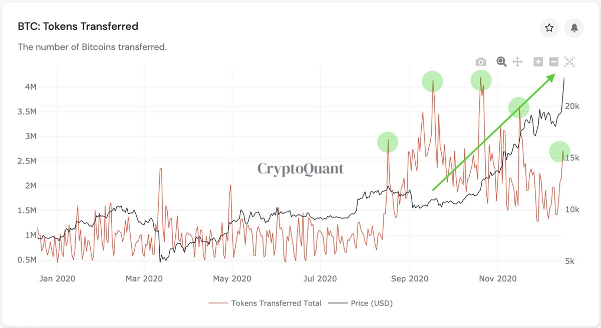 Otherwise, TX volumes are coming from non-exchange wallets. Since the price is eventually determined on exchanges, massive non-exchange transaction volume is considered as a bullish signal. These transactions include OTC deals.