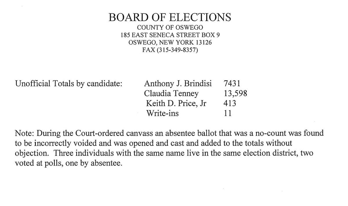 The final part is the new vote counts. Tenney picked up 1 vote in Oswego and Broome, and Brindisi picked up 3 in Broome.
