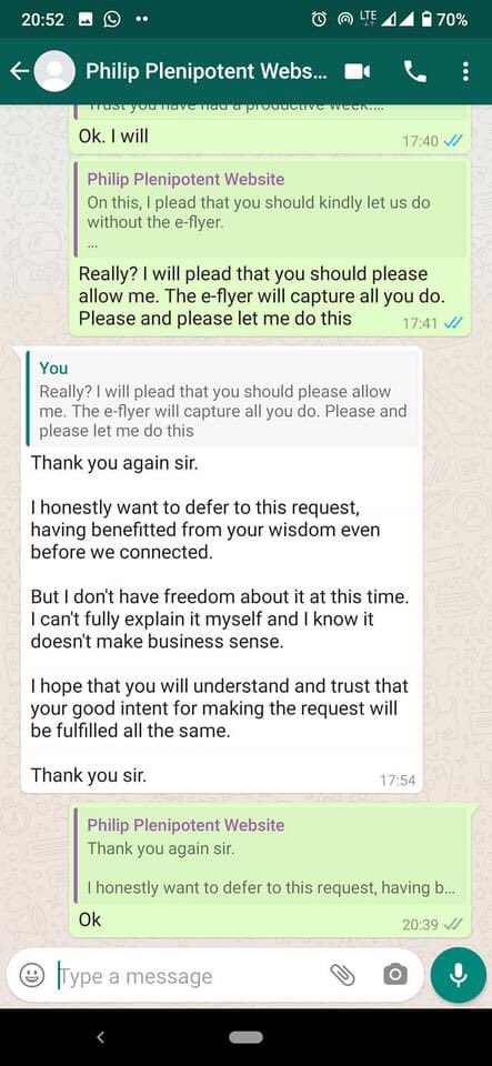 I asked him to send an e-flyer so I could at least appreciate him but he declined (see screenshots). He didn't want any public adulation. What a soul!