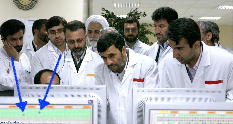 In una foto di Ahmadinejad in visita all'impianto, su uno schermo si notano, in grigio, due centrifughe non operative.