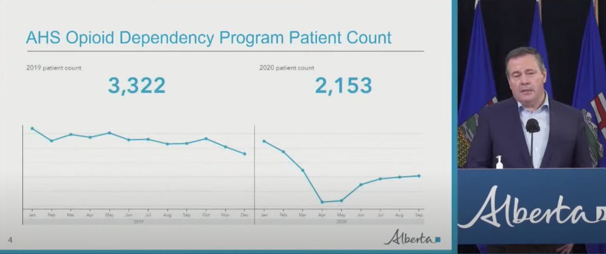 Yesterday, Alberta's premier announced 904 opioid overdose deaths from Jan. to Oct. 2020 (66% increase in the death rate y/y). He attributed this increase to CERB and reduced treatment access. I tweeted already about why it is not CERB, today let's look at treatment. #ableg