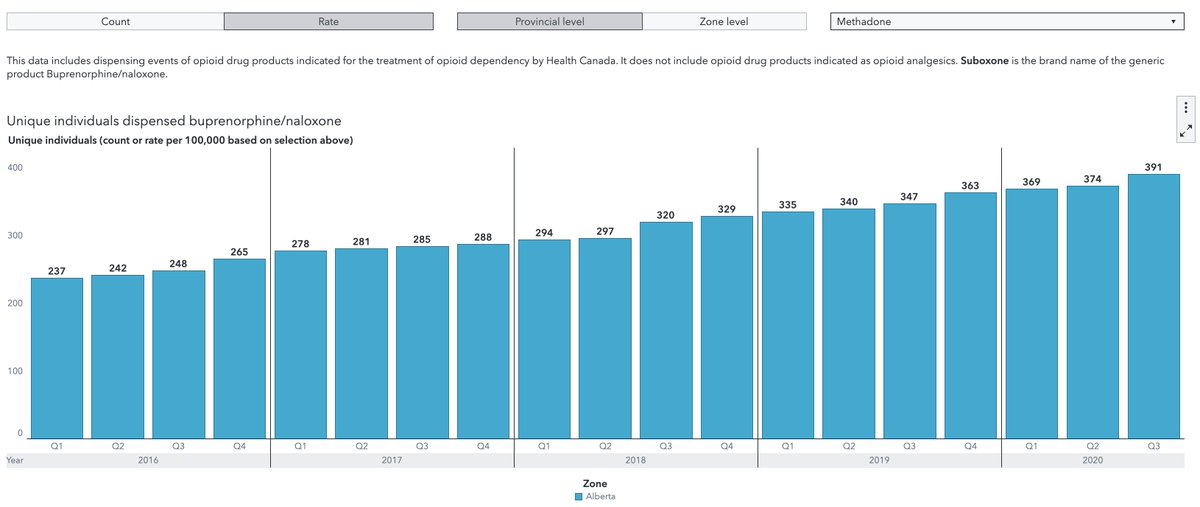 Thankfully, the provincial dashboard shows that despite this apparent huge drop in the # of patients enrolled in AHS ODP since March, the rates (pictured below) + counts of Albertans dispensed opioid dependence medications in 2020 has been quite stable quarter to quarter.