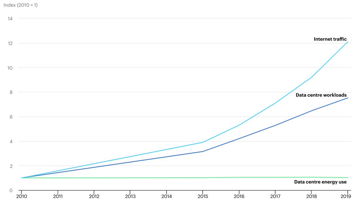 Ces études évoquent un accroissement de la consommation des Datacenters... qui n'a pas été observée dans les vingts années passées. Au contraire de nouvelles technologies (Edge, climatisation...) devraient accroitre l'efficacité de ceux ci iea.org/reports/data-c…