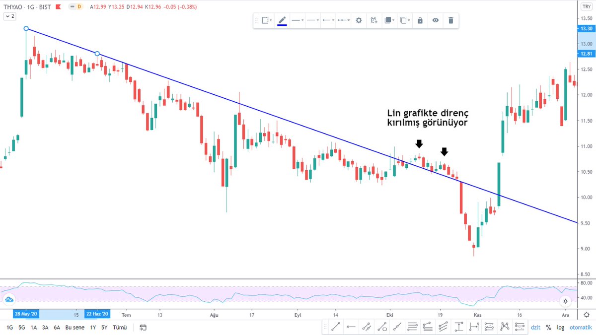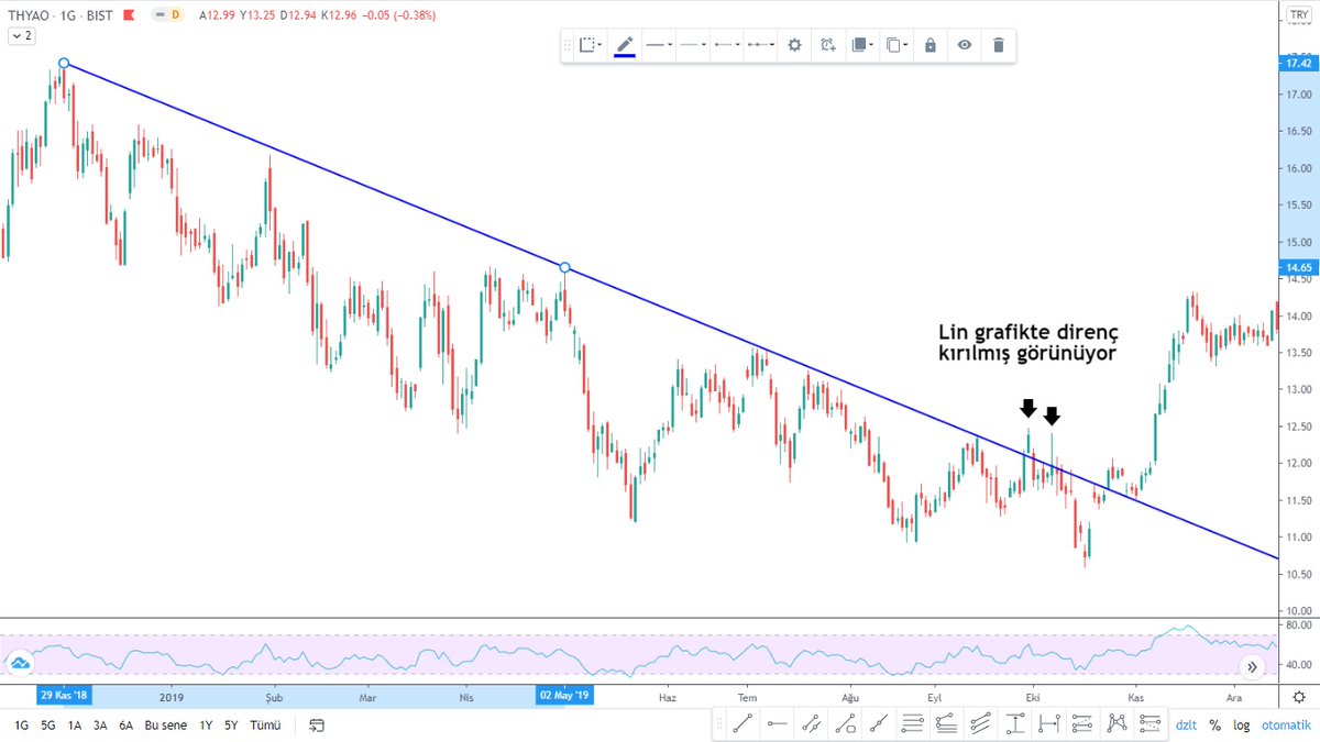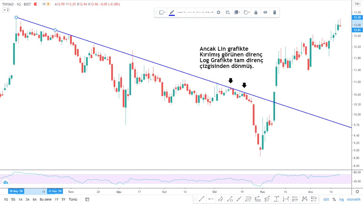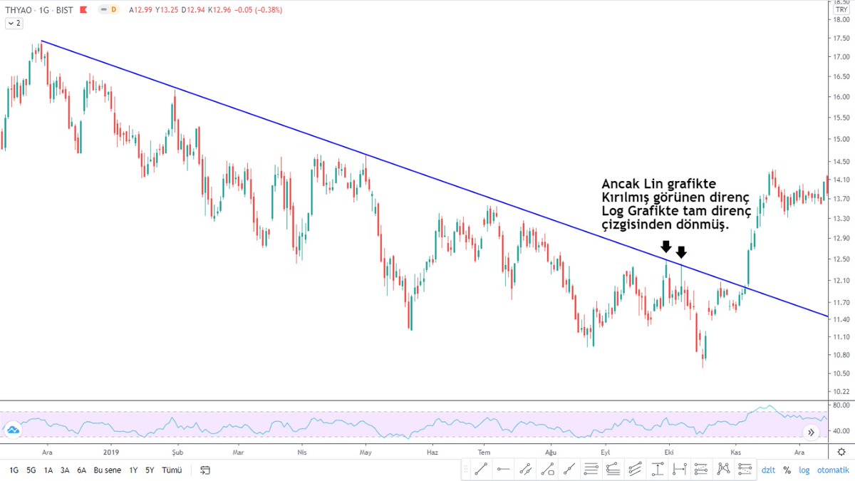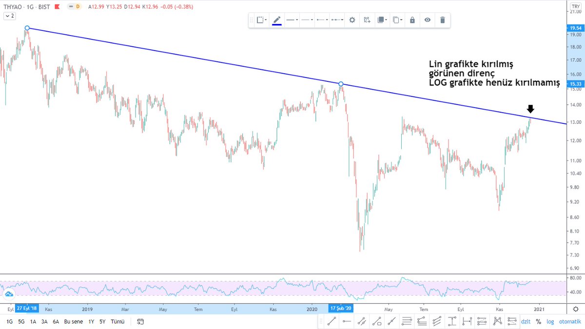 5- Bir diğer #thyao grafiğimiz de yakın geçmişten. Yine lin grafikte kırılmış görünen direnç log grafikte kırılmamış ve tam direnç çizgisinden dönmüş.