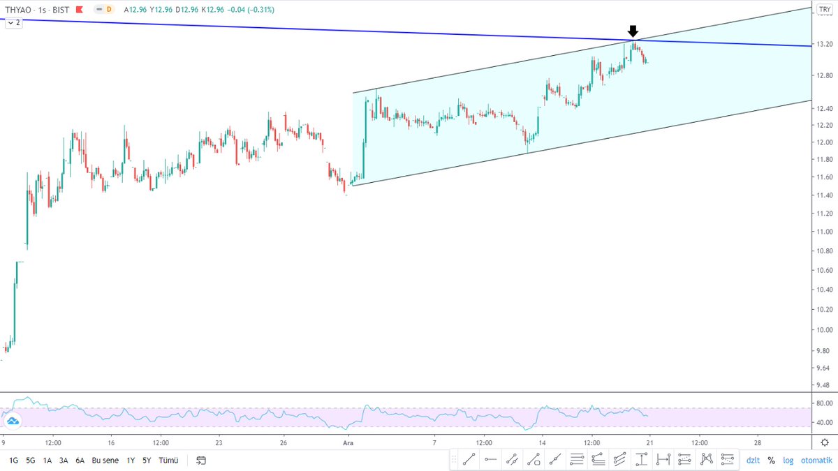 7- #Thyao hissesinde saatlik grafik de aşağıdaki gibi. Bir kanal oluşmuş ve fiyat yine bu log grafikteki düşen ile kanal tepesinin kesiştiği yerden dönmüş.