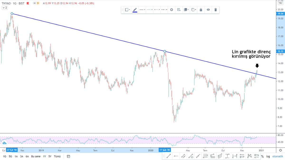 2- #thyao hissesinde uzun dönemli grafiğe baktığımızda genel olarak bir düşüş trendi var. Ve bu süreçte ara ara düşüş trendlerinin kırıldığına şahit olduk ancak çoğunluğu boğa tuzağı olarak kaldı. Tabi bu kırılım Lineer grafikte görünüyordu.