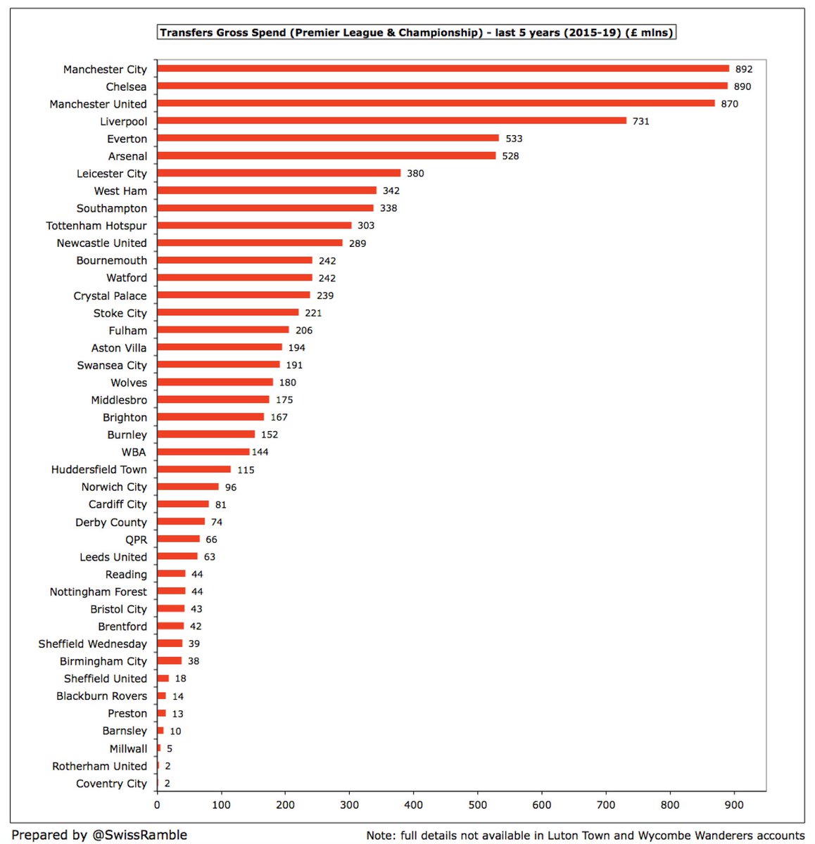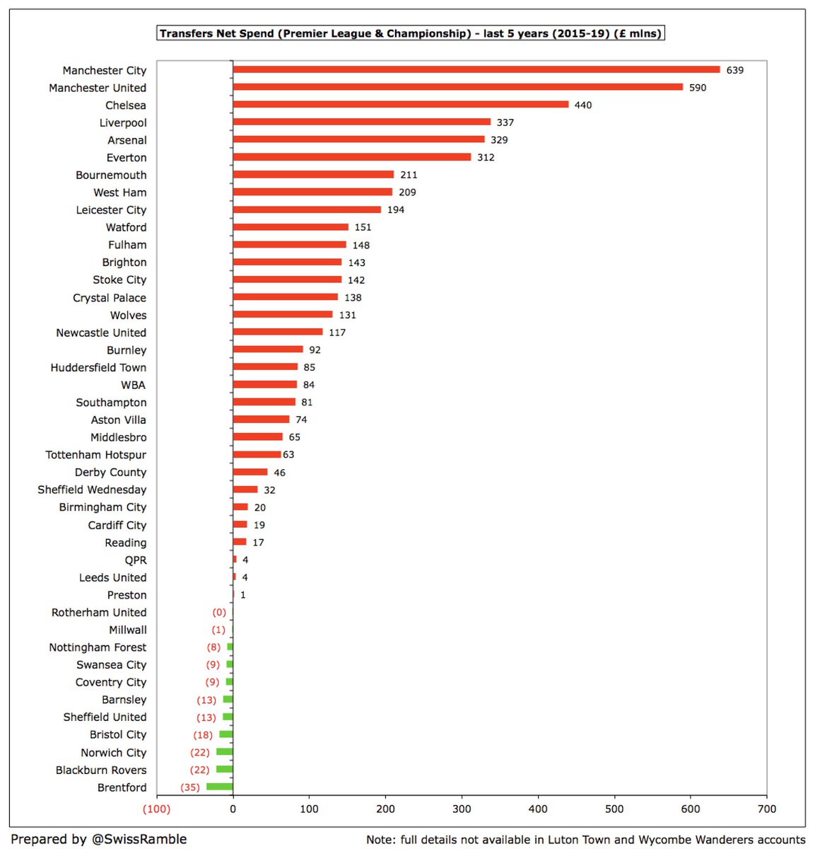 In terms of the infamous net spend, the two Manchester clubs have spent most on transfers (#MCFC £639m and #MUFC £590m), followed by #CFC £440m. #AFC fans will be appalled to discover they have spent around the same (£329m) as champions #LFC £337m.