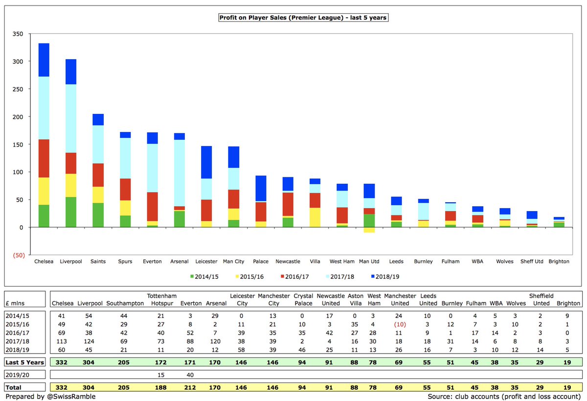 It is worth appreciating that profit on player sales can be very different from the value of the transfer. As one example, #MUFC shifted £280m of players in the 5 years up to 2018/19, the 3rd highest in the Premier League, but their profit was only £69m, 13th highest in the PL.
