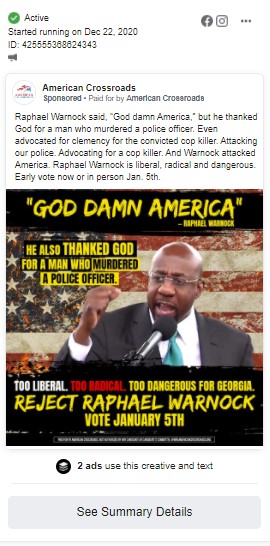 The ads claimed that Warnock said "God Damn America" as an expression of his own views.