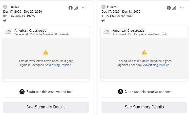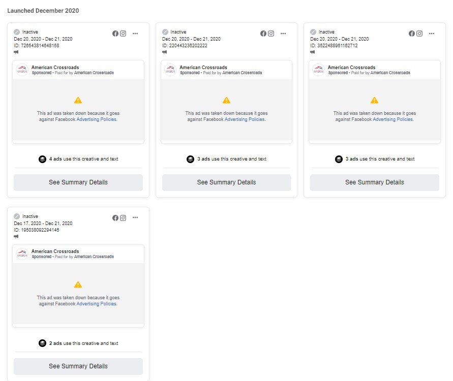 1. American Crossroads had ads removed by Facebook because of a brutally dishonest attack on Warnock.