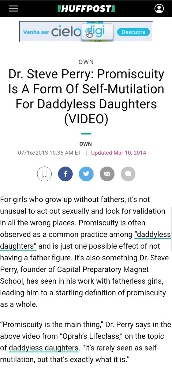 A mídia canalha controlada por pautas feministas que visam a destruição de relacionamentos, a aniquilação da masculinidade e a morte espiritual de mulheres, tende a postar asneiras do tipo "mulher que cresce sem pai é empoderada".