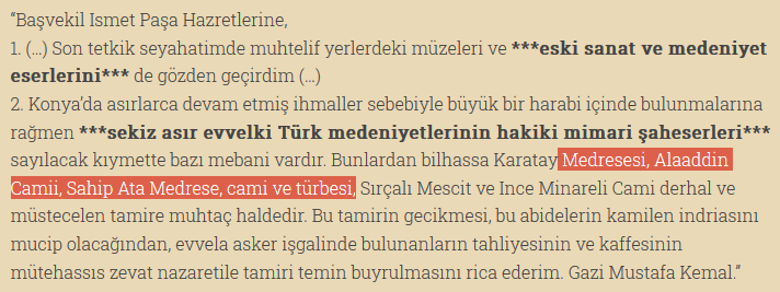 Bir belgede ise M.Kemal’in Konya’daki Alaaddin Camii’nin tamirini yapılmasını emrettiği yazar.Bahsi geçen belgenin metnini buraya alalım: