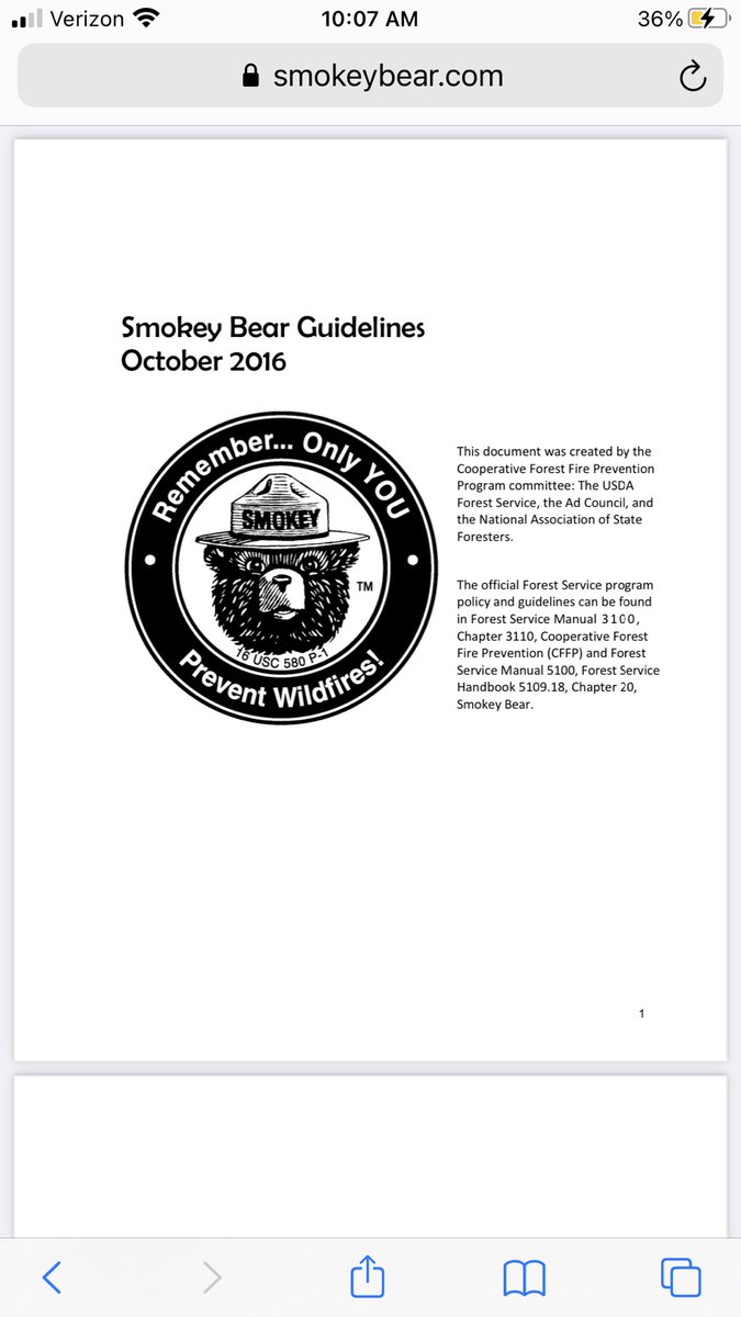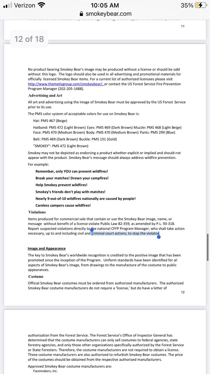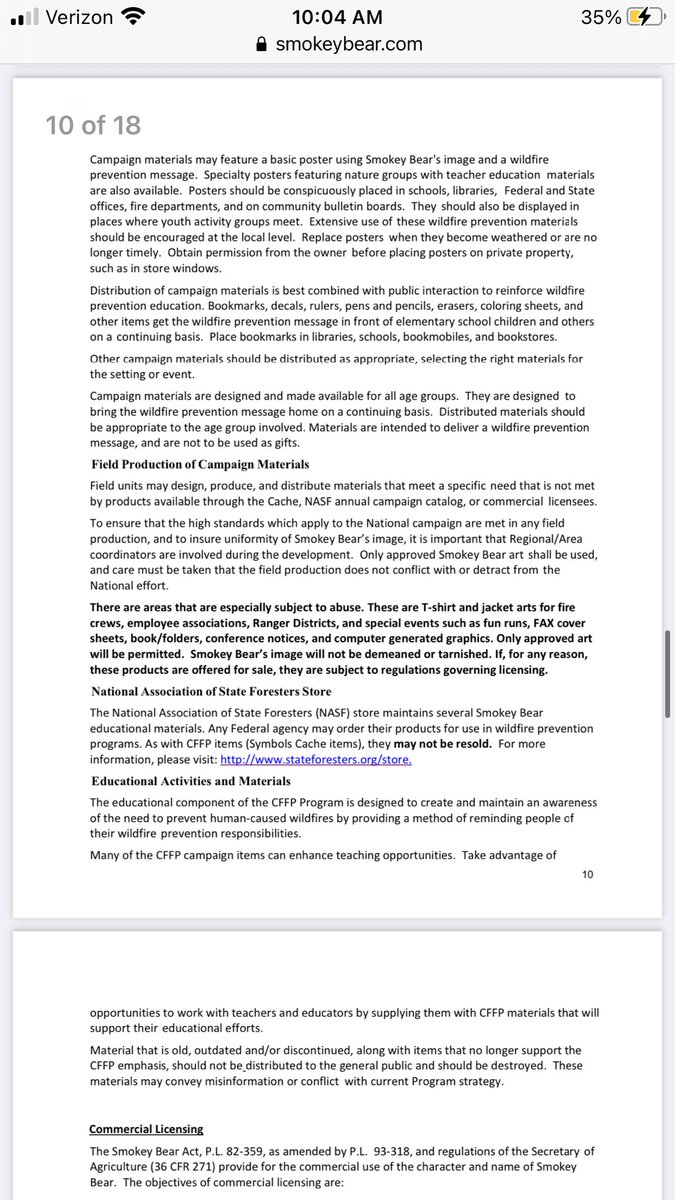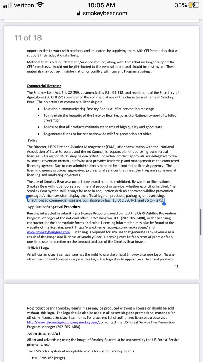 My research has taken me to the official Smokey Bear Guidelines document authorized by the Wildlife Service, which references criminal penalties for misuse.