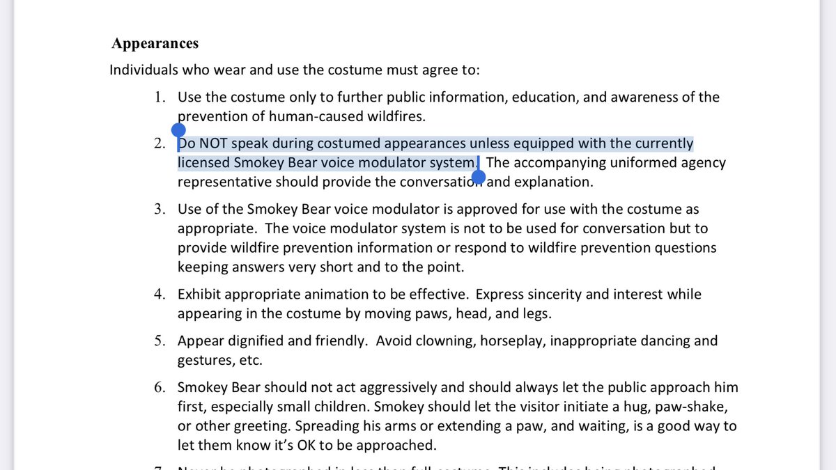 Smokey Bear’s 18-page regulation guideline punishable by jail includes instructions for those who wear the bear costume, including to always use the Smokey voice modulator.