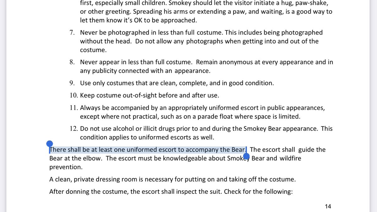 “There shall be at least one uniformed escort to accompany the Bear. The escort shall guide the Bear at the elbow. The escort must be knowledgeable about Smokey Bear and wildfire prevention.”