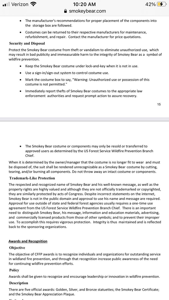 Pages 15 and 16 of the Smokey Bear regulations (whose criminal enforcement the Omnibus Bill will repeal) explain proper handling of the Bear costume.