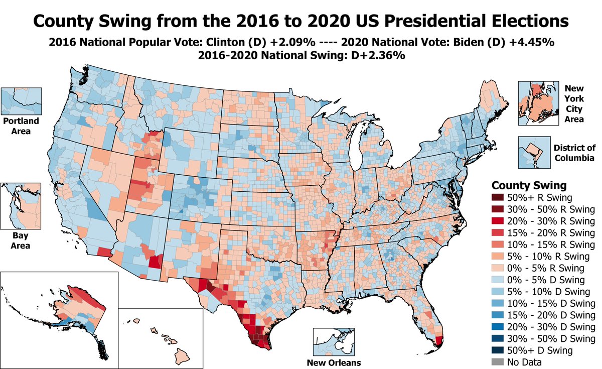 The national popular vote shifted 2.4 pts towards the Democrats (from Clinton +2.1 to Biden +4.5). If we map county changes RELATIVE to that national swing it flips many rural counties from blue to red, meaning that they swung Biden, but by less than the nation's 2.4 pt swing: