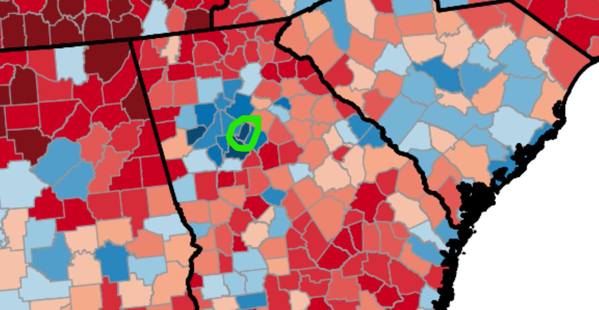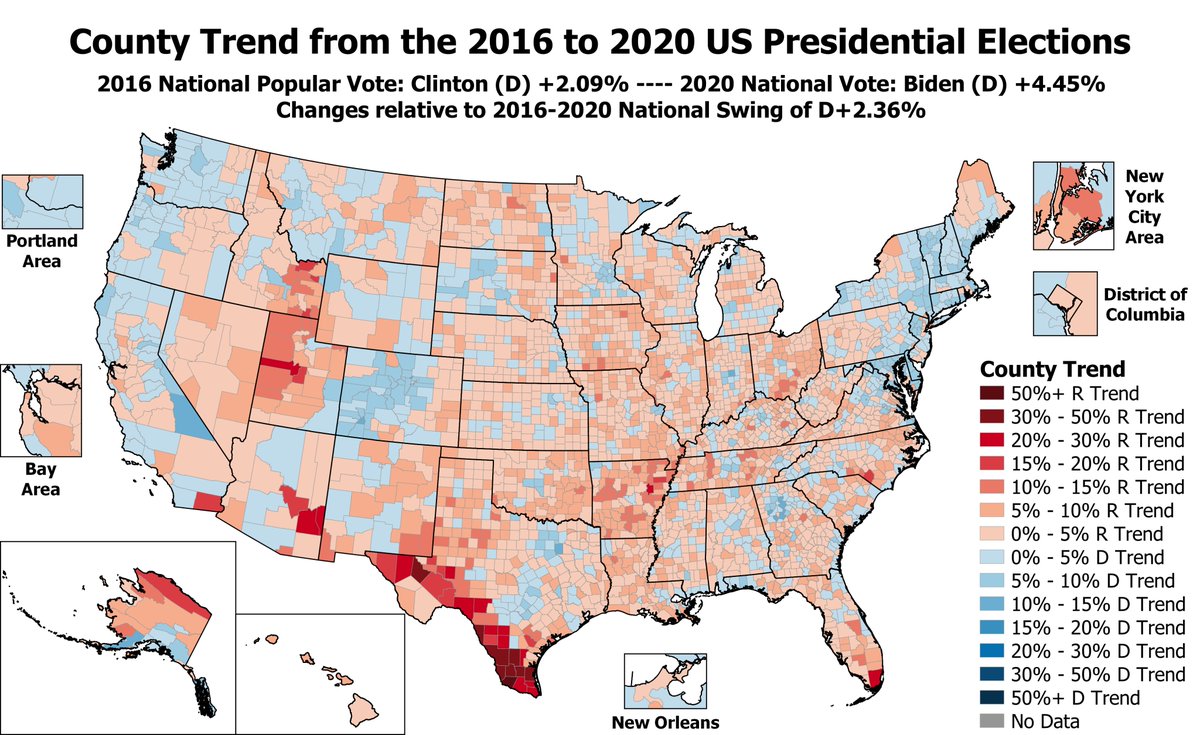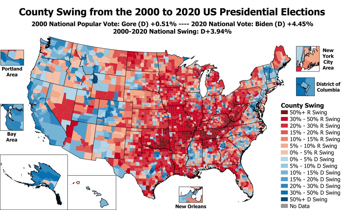 Here is the same map in "Trend" form, so county changes are RELATIVE to the 4 pt Democratic swing nationally from 2000-2020. The areas trending towards Democrats since 2000 tend to be larger in population. For example, Biden was able to flip GA while most GA counties trended GOP: